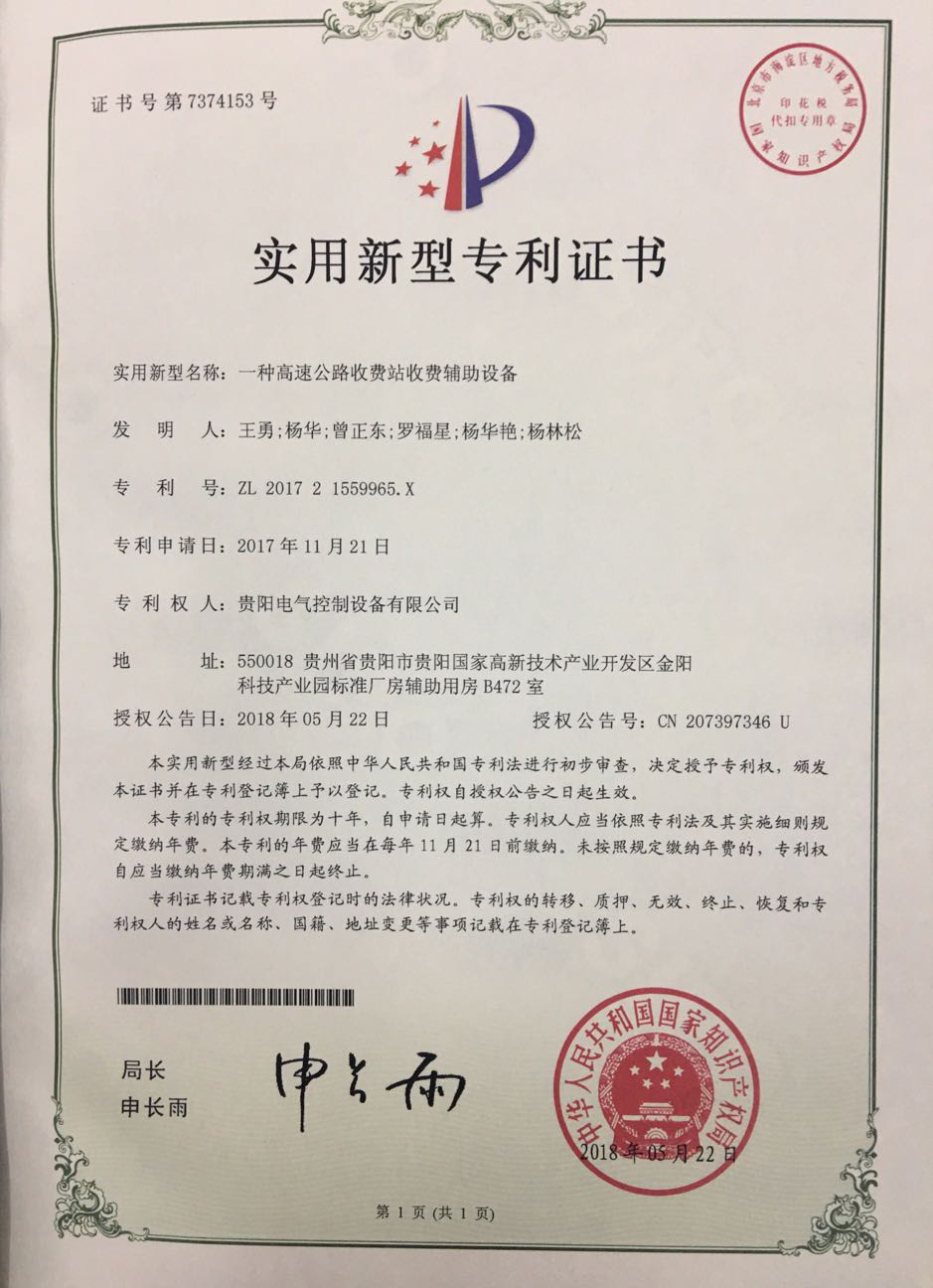 由貴控公司技術(shù)中心主導研發(fā)的"高速公路隧道視覺環(huán)境改善設(shè)備、高速公路收費站收費輔助設(shè)備、節(jié)能高速公路隧道照明監(jiān)控裝置、預(yù)應(yīng)力智能張拉裝置、多功能行程限位器檢測裝置"。經(jīng)國家知識產(chǎn)權(quán)局評審,5項專利項目全部獲得國家實用新型專利證書,專利權(quán)期限均為10年。