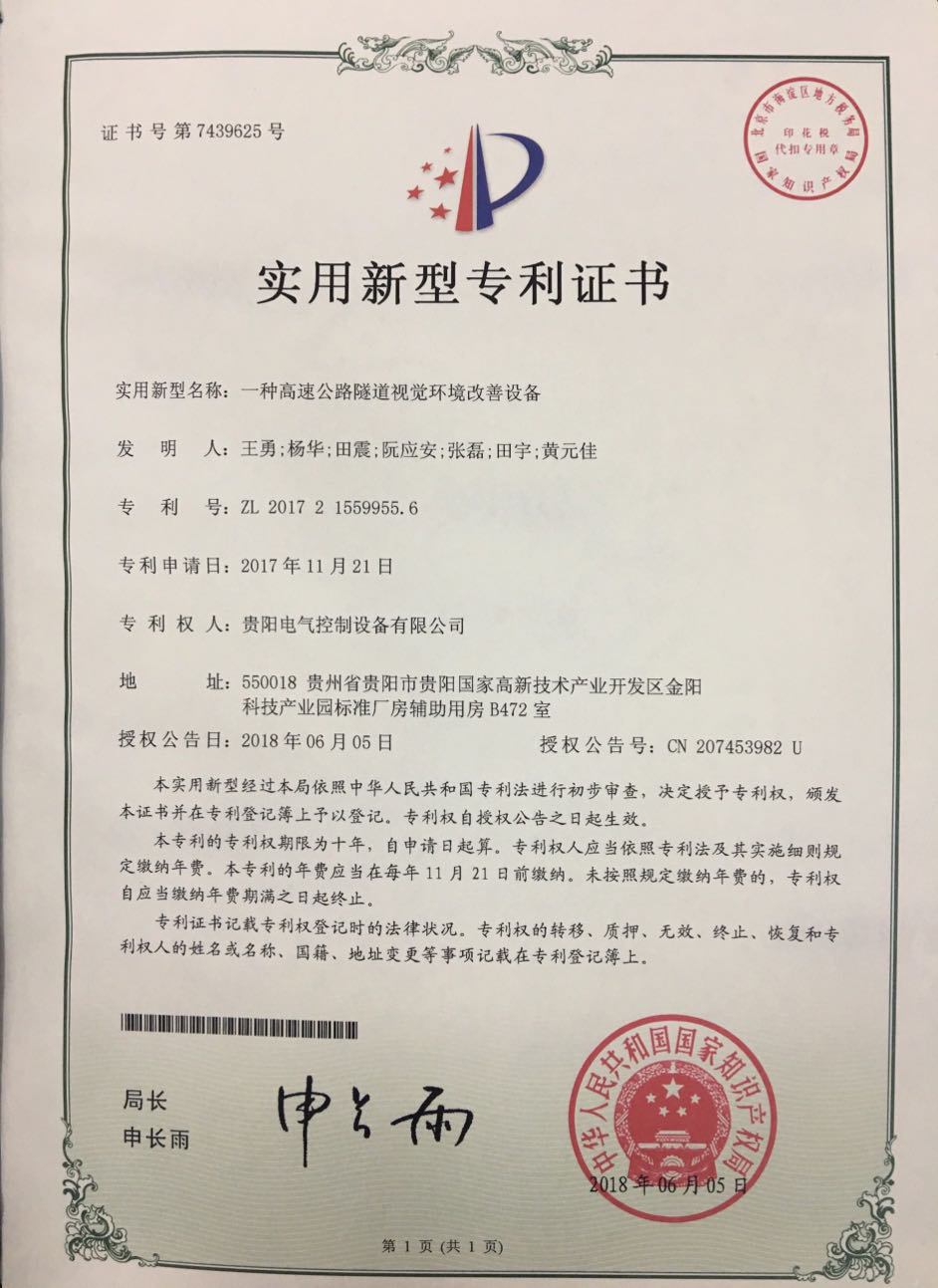 高速公路隧道視覺環(huán)境改善設(shè)備專利證書