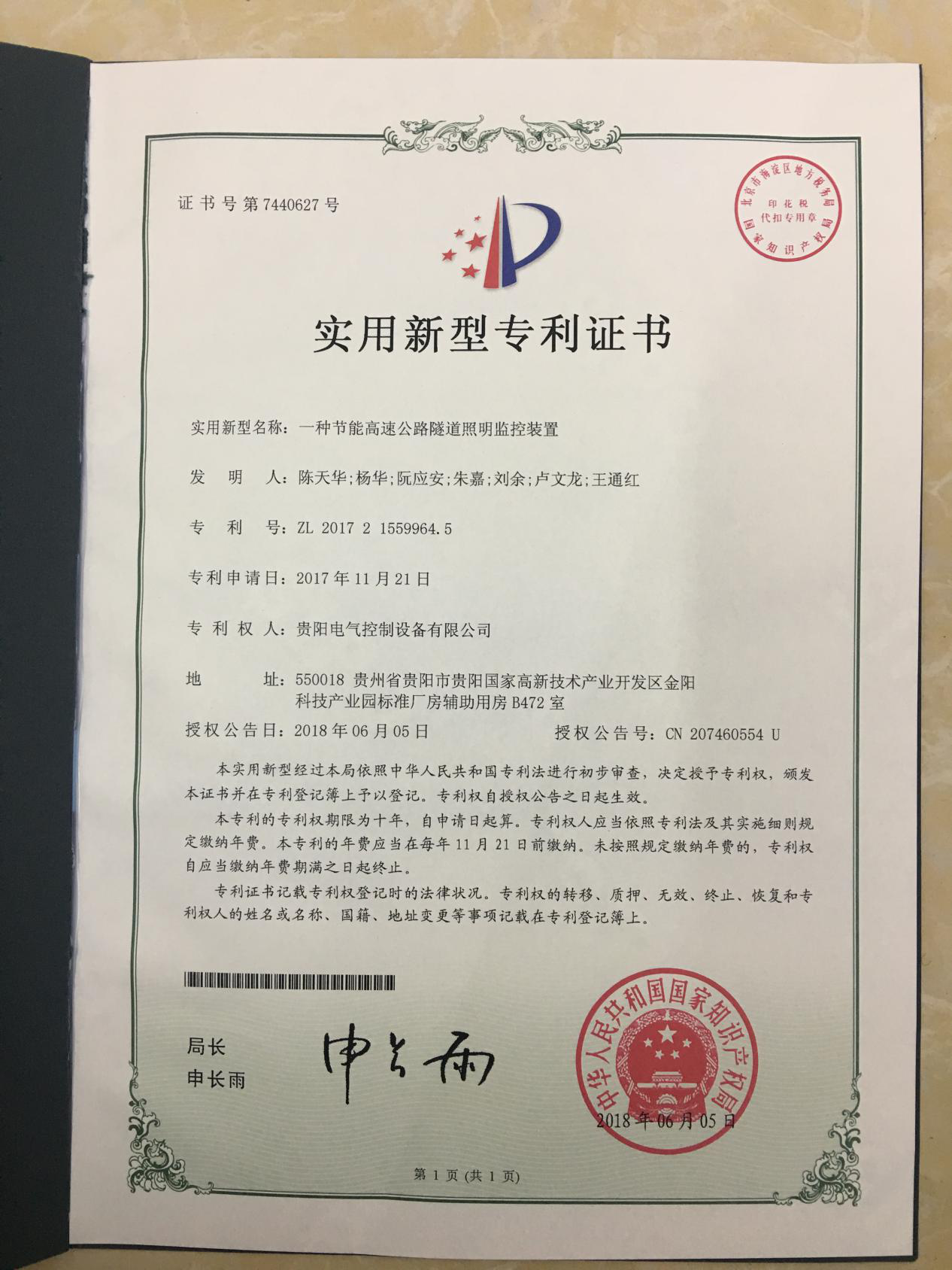 節(jié)能高速公路隧道照明監(jiān)控裝置專利證書