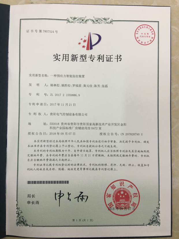 預(yù)應(yīng)力智能張拉裝置專利證書