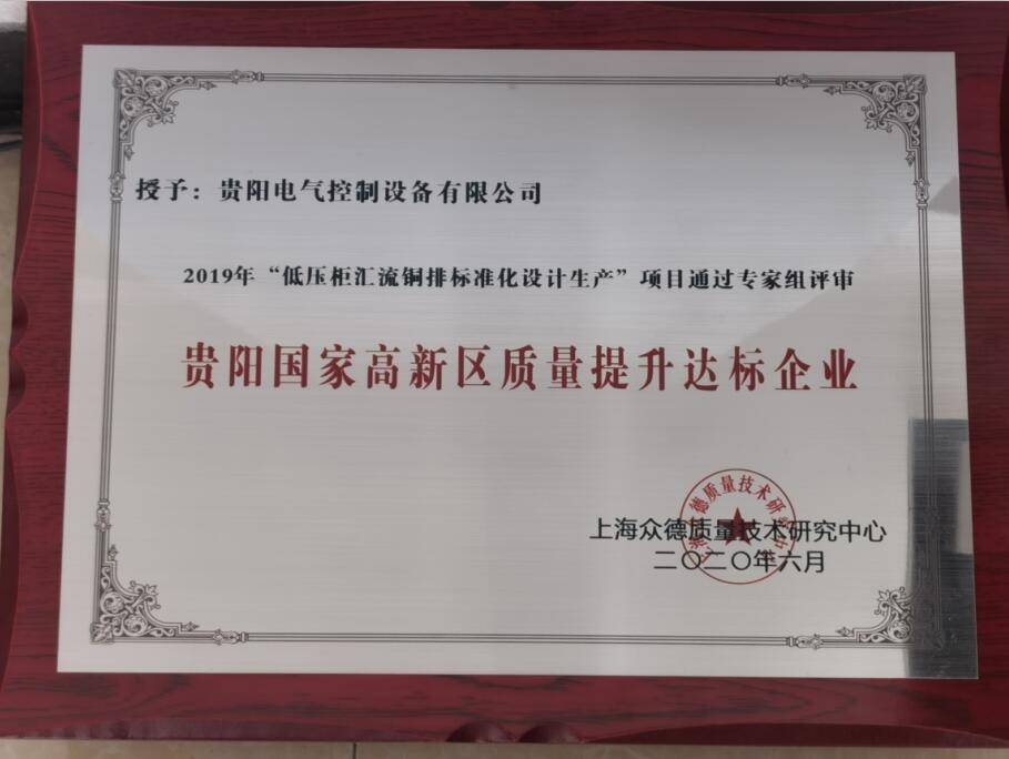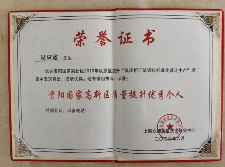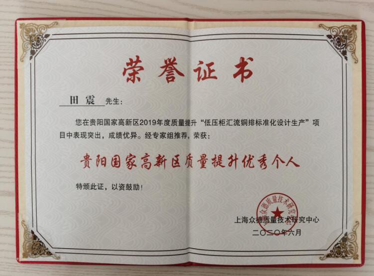 據(jù)悉,為深入貫徹十九大精神,堅(jiān)持質(zhì)量第一,效益優(yōu)先,促進(jìn)經(jīng)濟(jì)結(jié)構(gòu)優(yōu)化升級(jí),大力推動(dòng)高質(zhì)量發(fā)展的精神。由貴陽國家高新區(qū)牽頭組織了18家轄區(qū)企業(yè),申報(bào)21個(gè)質(zhì)量提升項(xiàng)目,最后,經(jīng)專家組綜合評(píng)審,高新區(qū)有3家企業(yè)和7名技術(shù)人員得到表彰,其中貴控公司《2019年低壓柜匯流銅排標(biāo)準(zhǔn)化設(shè)計(jì)生產(chǎn)》項(xiàng)目獲得高新區(qū)質(zhì)量提升達(dá)標(biāo)企業(yè)的授牌,我司技術(shù)中心田震,易應(yīng)寬兩同志榮獲貴陽國家高新區(qū)質(zhì)量提升優(yōu)秀個(gè)人。